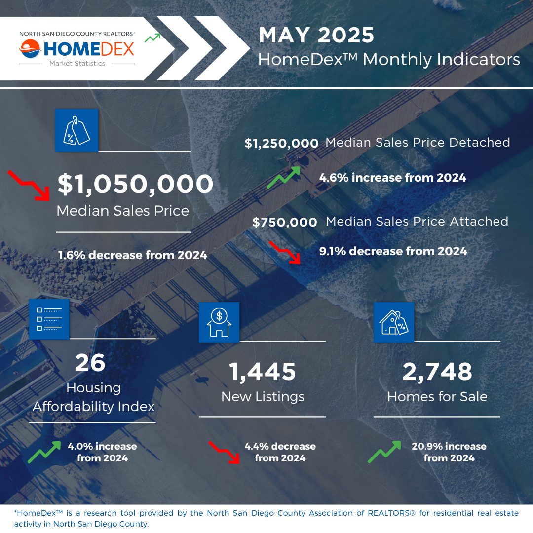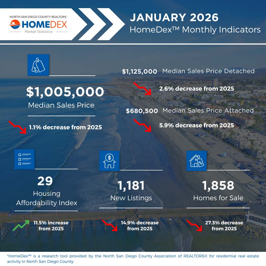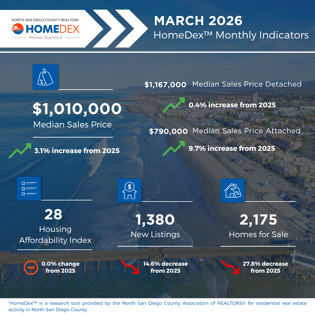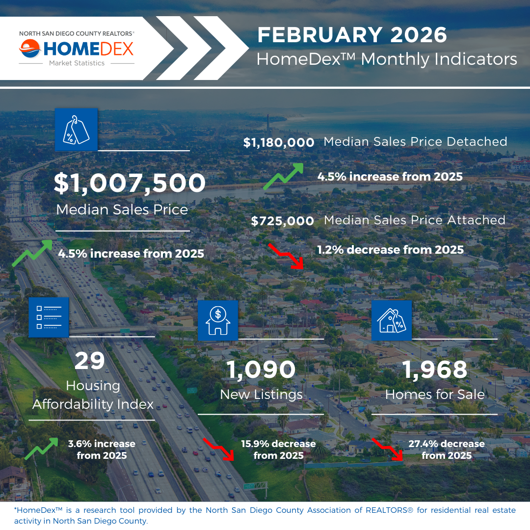HomeDex™, a service provided by 10k Research, is the most comprehensive source of real estate data for North San Diego County. From key metrics, including new listings, pending sales, days on the market, and median sales prices, HomeDex™ provides monthly and yearly rolling insight into detached single-family and attached single-family homes.