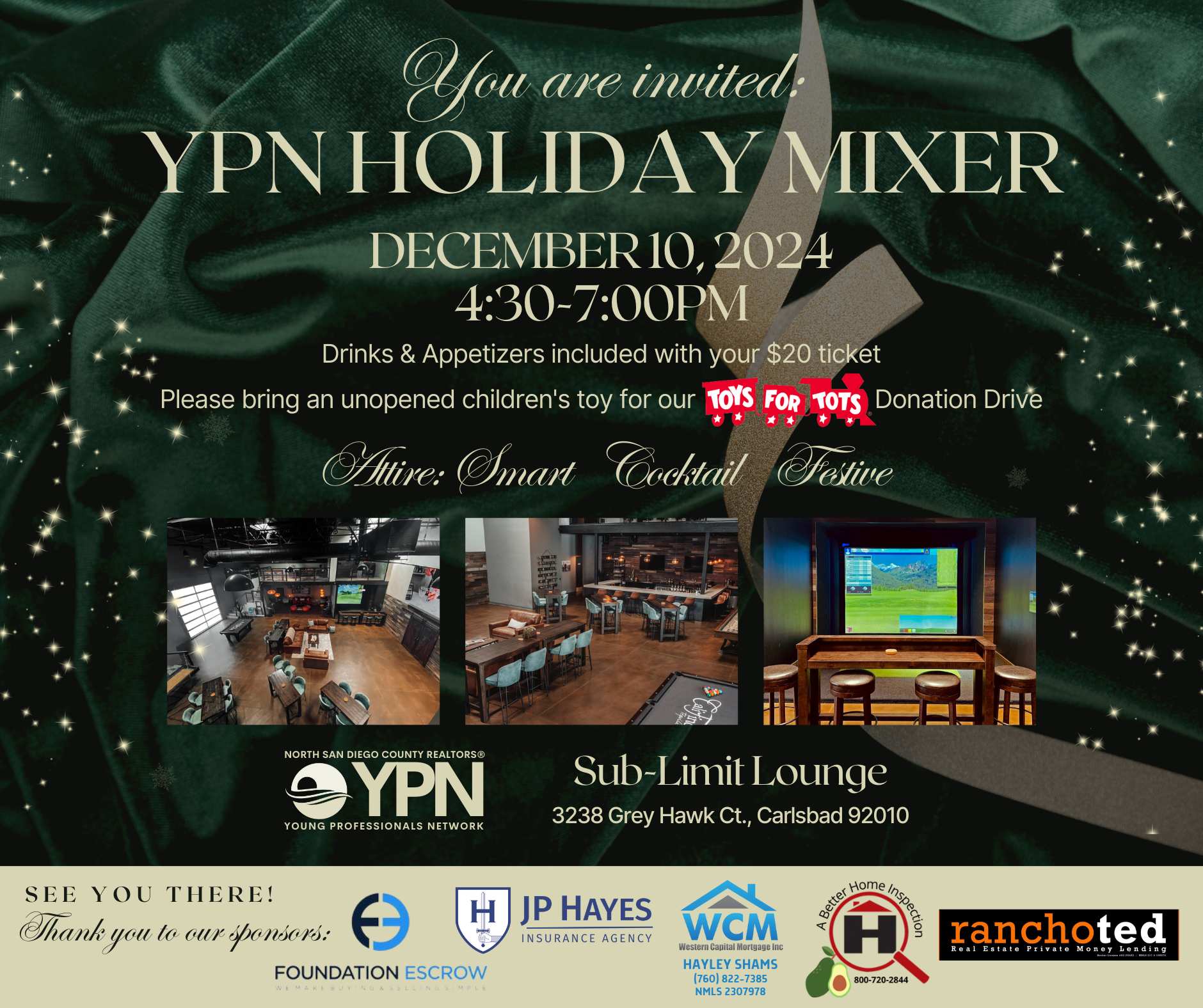 Mark your calendar for December 10th, 4:30-7:00pm, at Sub-Limit Lounge in Carlsbad! Your $20 ticket includes drinks, appetizers, and all the holiday cheer you can handle.