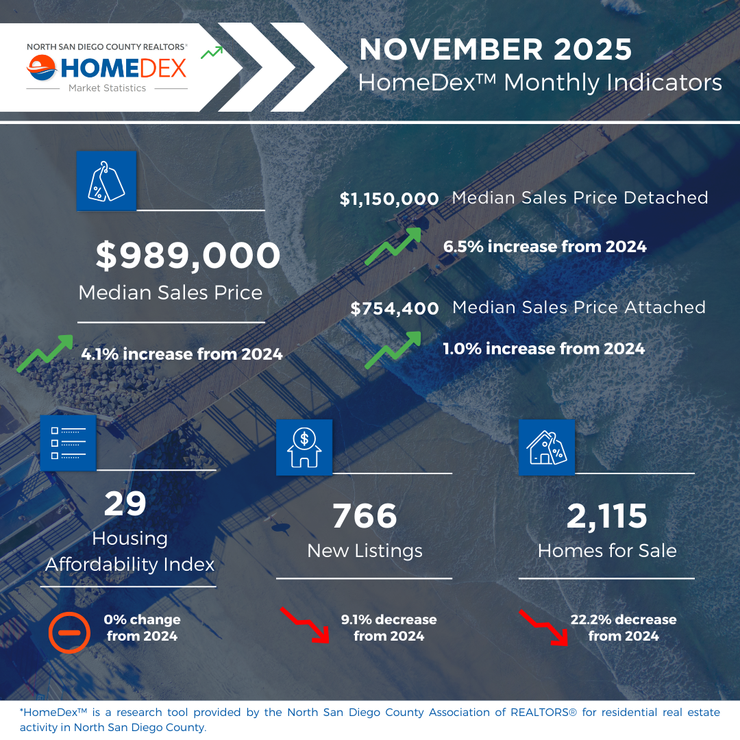 HomeDex™, a service provided by 10k Research, is the most comprehensive source of real estate data for North San Diego County. From key metrics, including new listings, pending sales, days on the market, and median sales prices, HomeDex™ provides monthly and yearly rolling insight into detached single-family and attached single-family homes.
